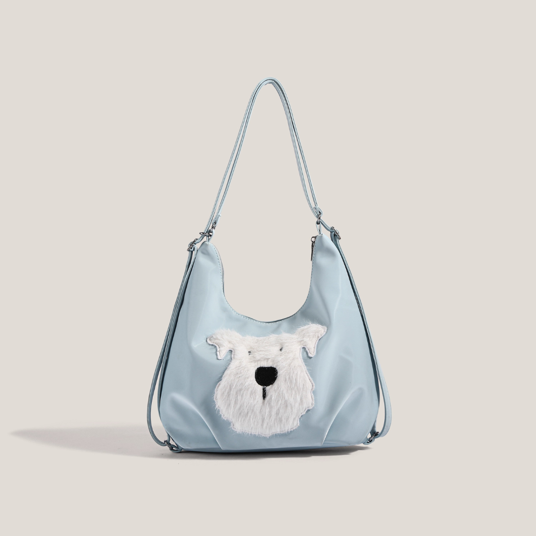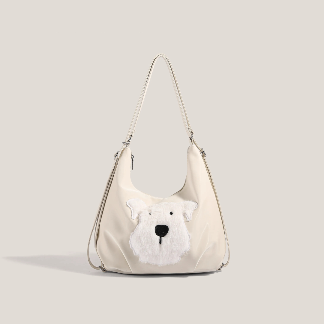 Glossy shoulder bag with a fluffy dog patch and a soft, roomy silhouette